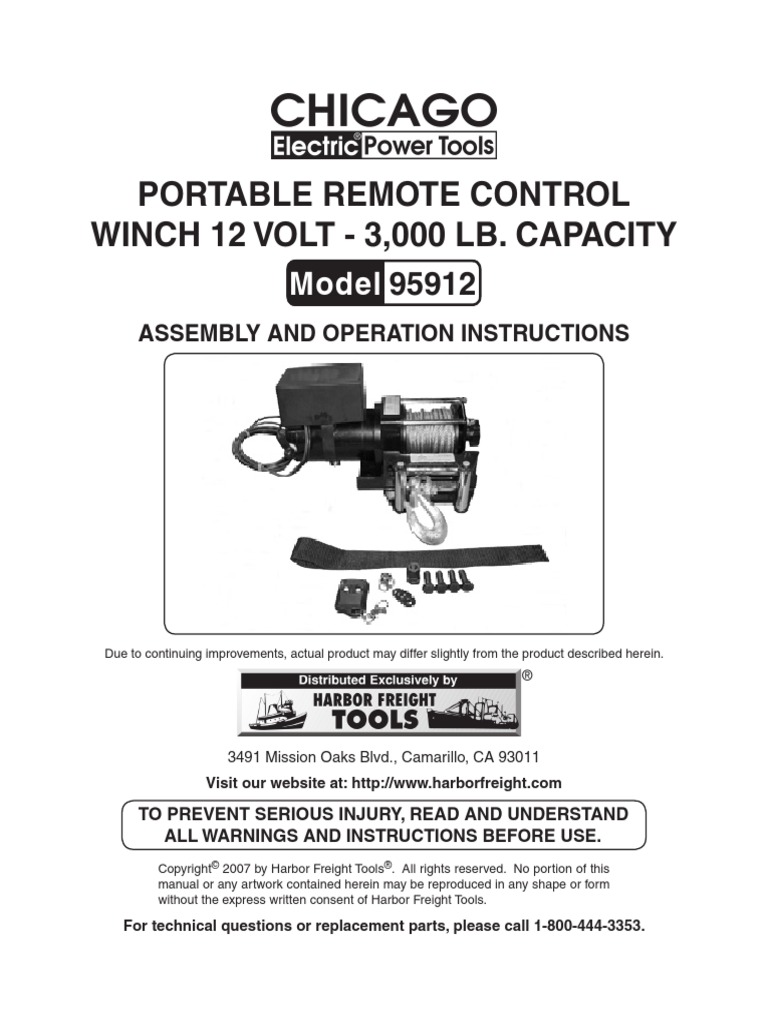 Chicago Electric Power Tool 3000 Lb Winch W Wireless Remote