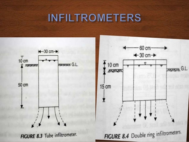 Description the standard double ring infiltrometer set consists of three pairs of inner and outer rings a driving plate an impact absorbing hammer measuring bridges and measuring rods with floats. Using a double ring infiltrometer is a relatively simple although slow method of measuring soil the hydraulic conductivity or design infiltration rate of a soil. Describes the double ring infiltrometer as often being constructed from thin walled steel pipe with the inner and outer cylinder diameters being 20 and 30 cm respectively. There are two operational techniques used with the double ring infiltrometer for measuring the flow of water into the ground.