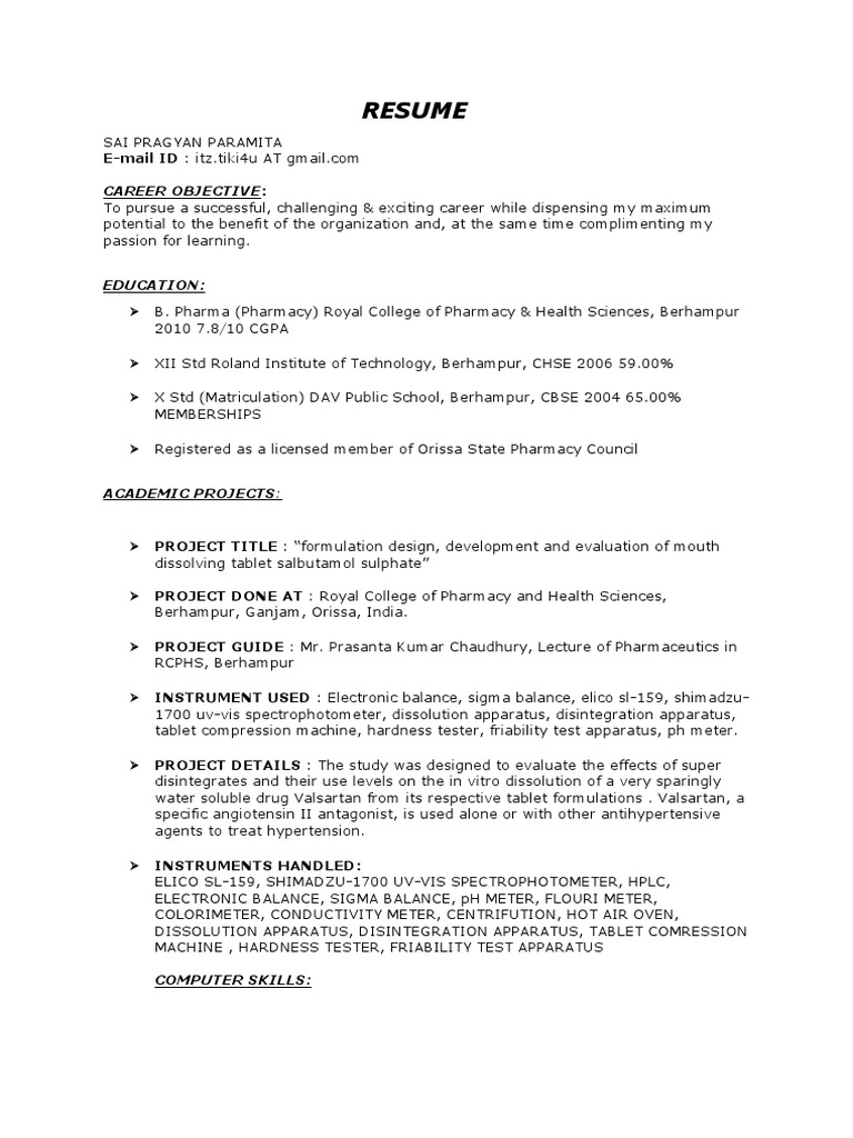 B Pharmacy Resume Format For Freshers Job Resume Format