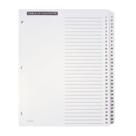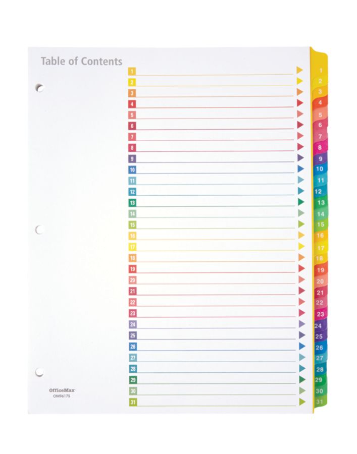 31 table of contents dividers at office depot officemax. From basic office supplies such as printer paper and labels to office equipment like file cabinets and stylish office furniture office depot and officemax have the office products you need to get the job done. 8 table of contents dividers at office depot officemax. Many dividers come 3 or 7 hole punched for quick insertion into a binder.