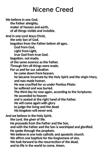 There is also a printable text version to download. The nicene creed is a famous statement of christian faith the original form of which dates back to the council of nicaea in ad325. We believe in one lord jesus christ the only son of god eternally begotten of the father god from god light from light true god from true god begotten not made. Nicene creed we believe in one god the father the almighty maker of heaven and earth of all that is seen and unseen.