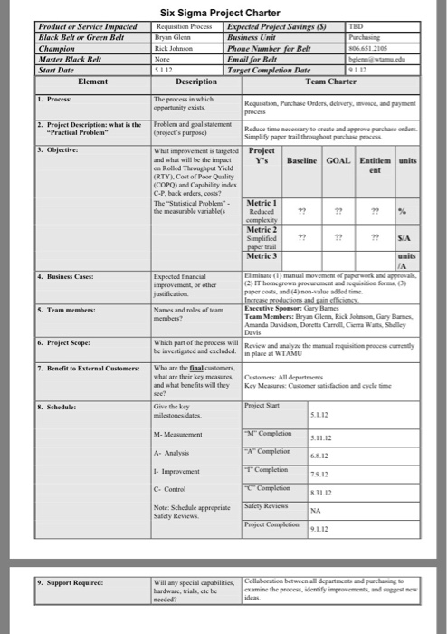 Project Management Charter Template Six Sigma Project